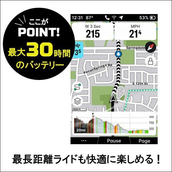 スピード、距離、パワー、ケイデンス、走行ログ、ナビゲーション、風量