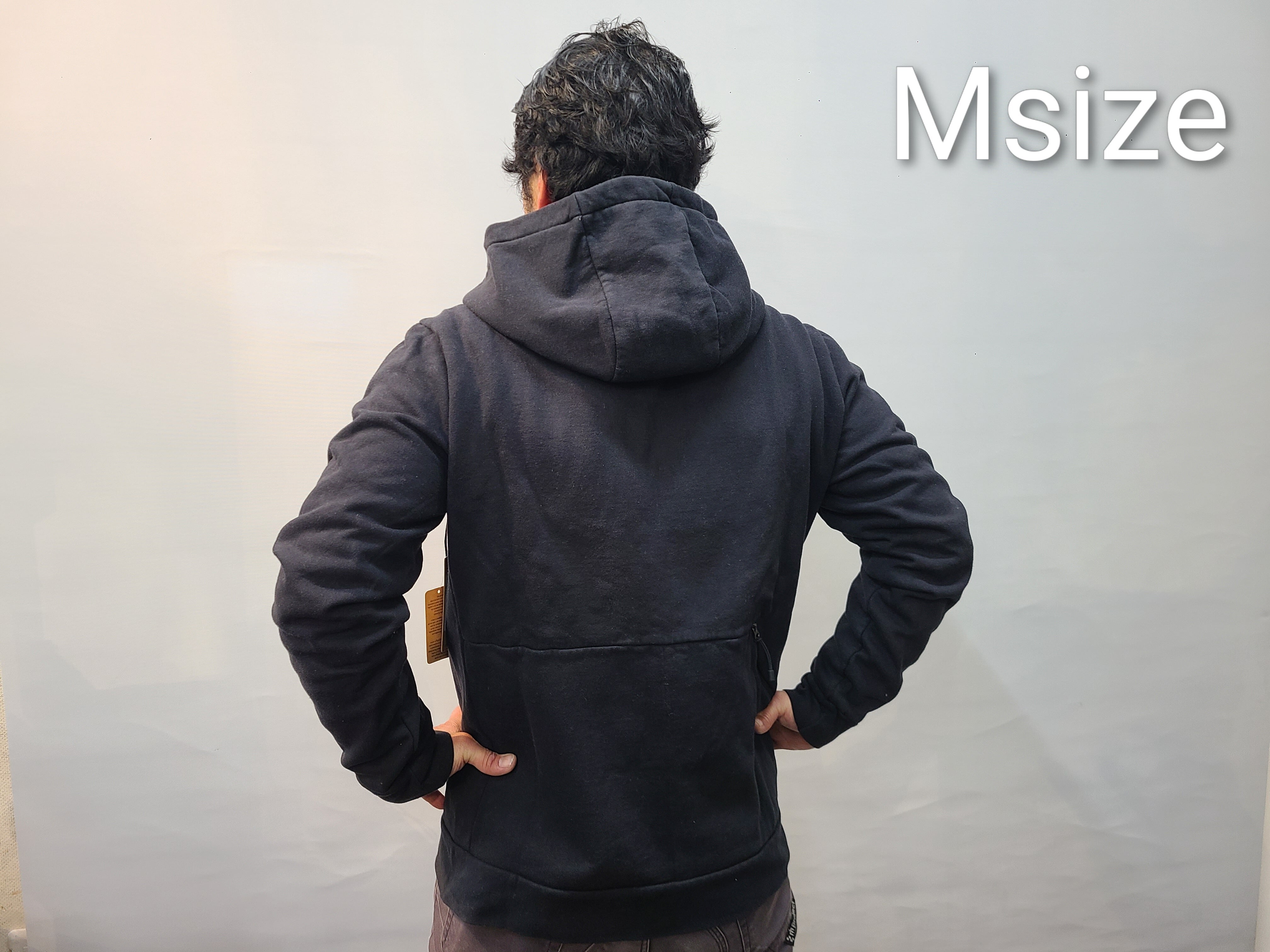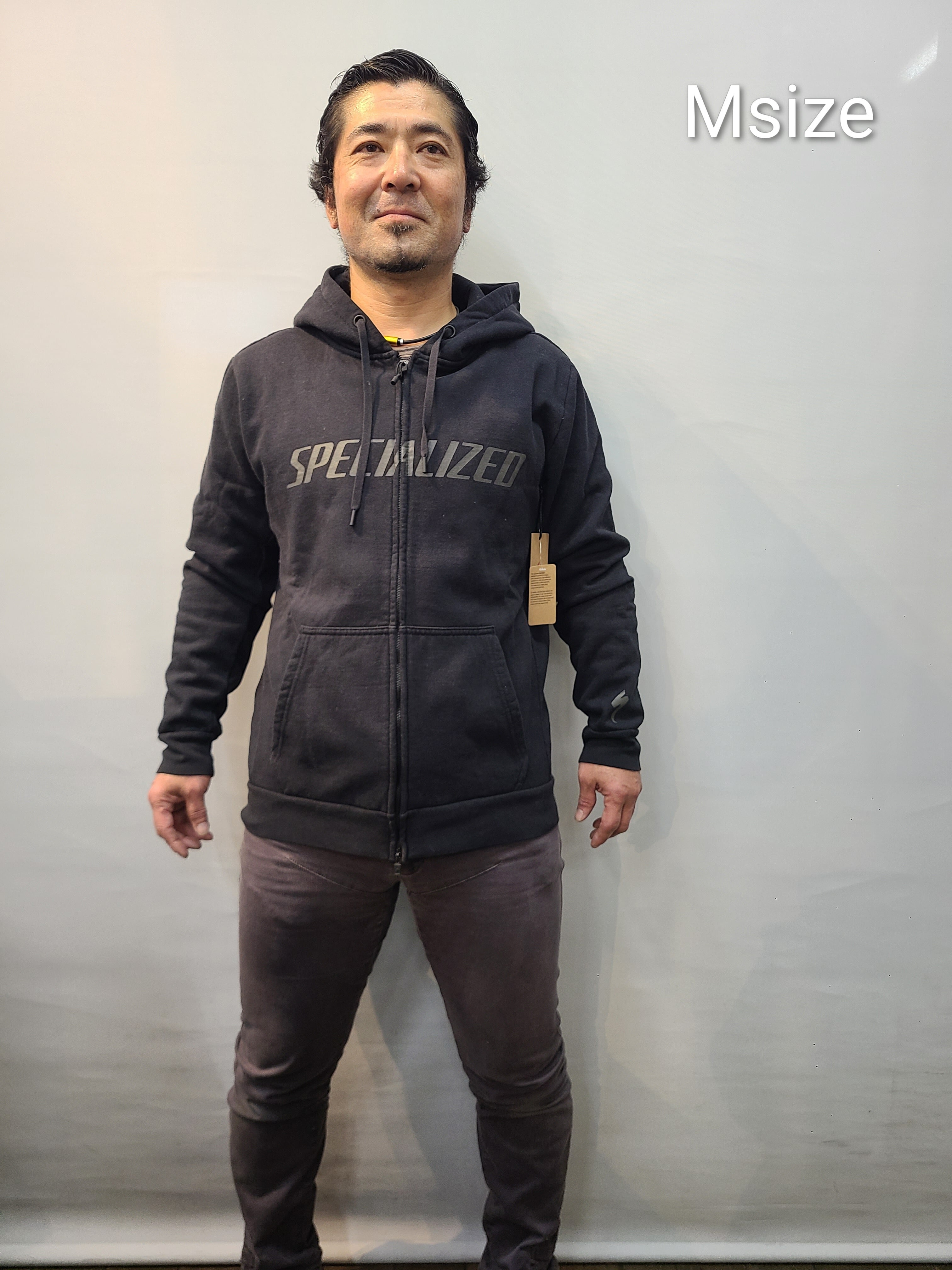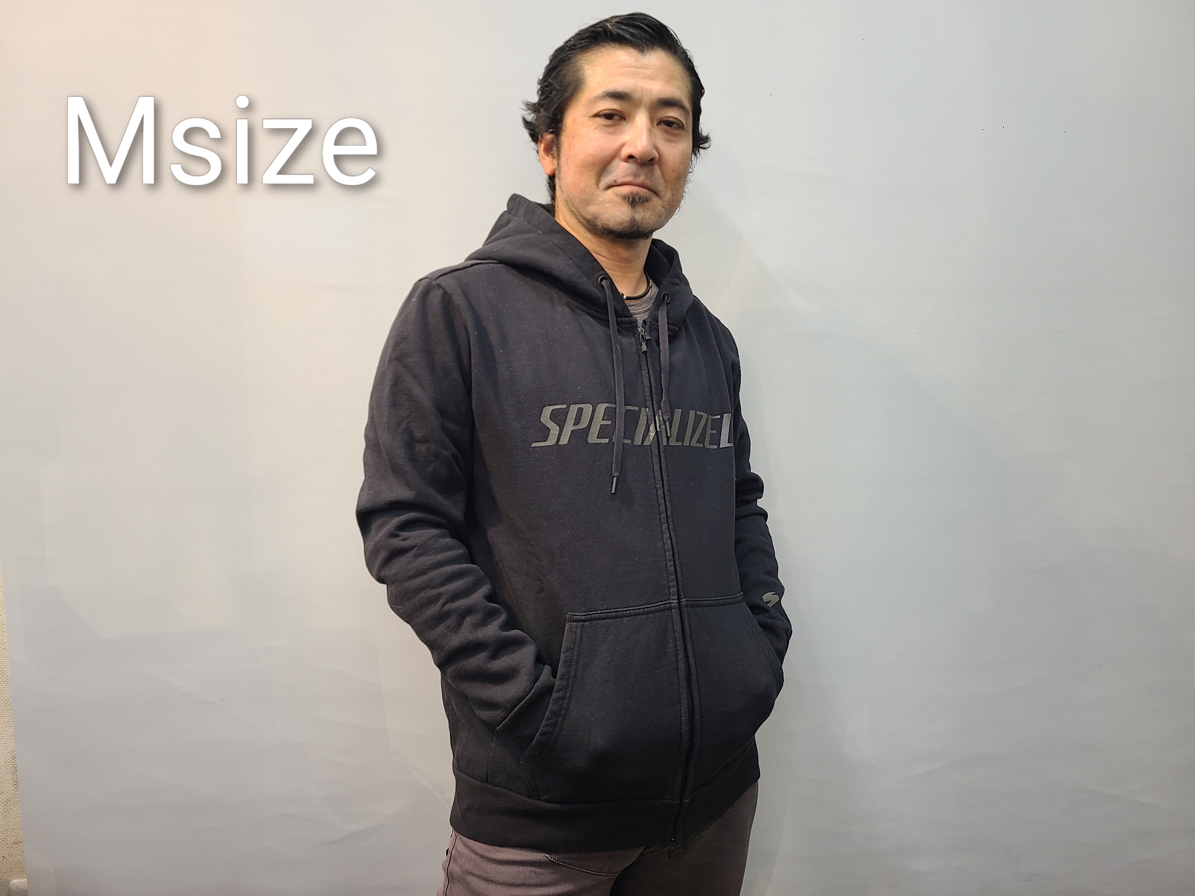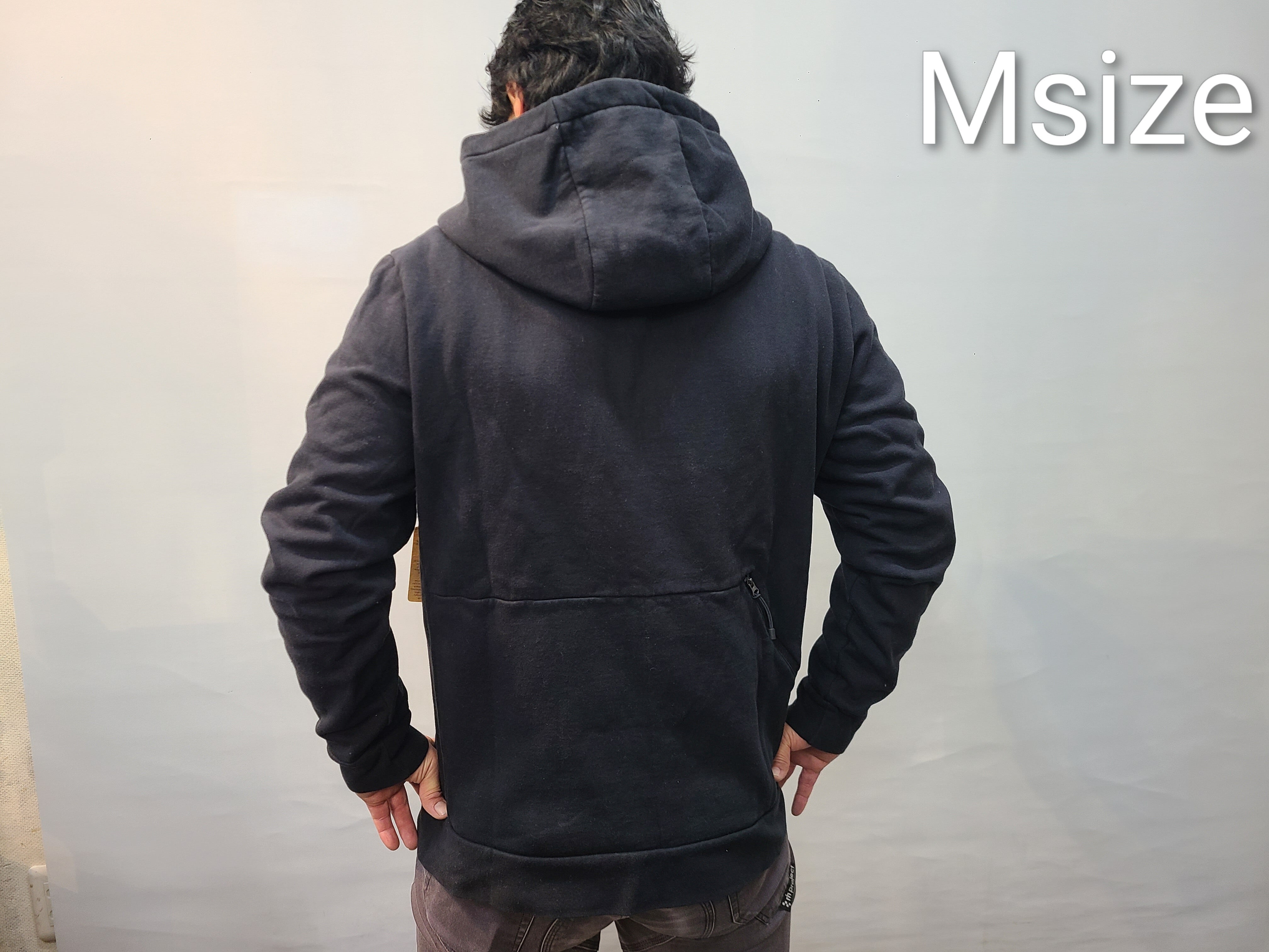 日本人の着用モデルは、当店のスズキ168cm、胸囲95cm、体重75kgが着用してみた感じです。パーカーの中は、ぴったりしたアンダーを一枚着用しています。Sでちょうど、Mならゆとりあり、Mだと着丈が少し長いかなという感じになりました。