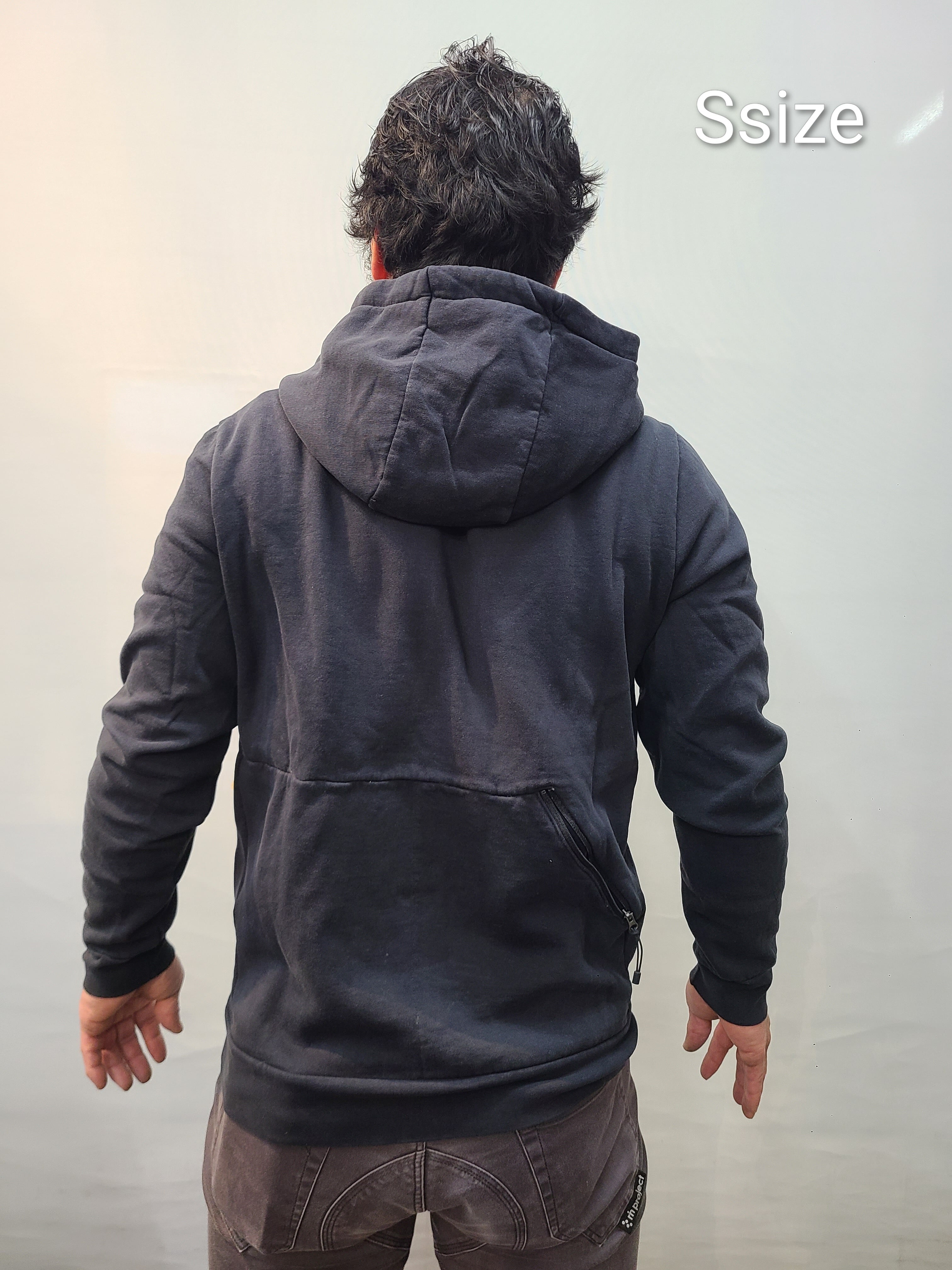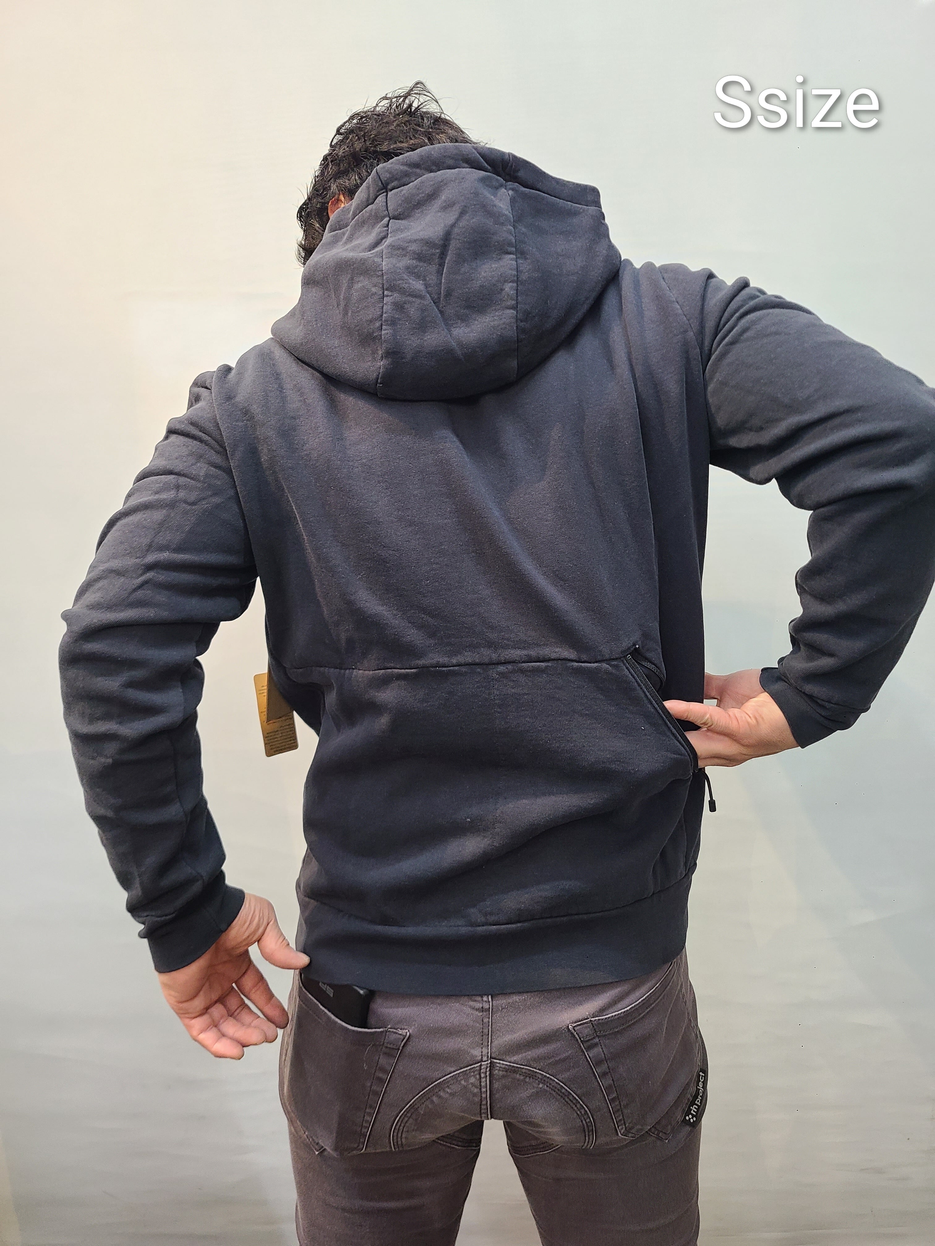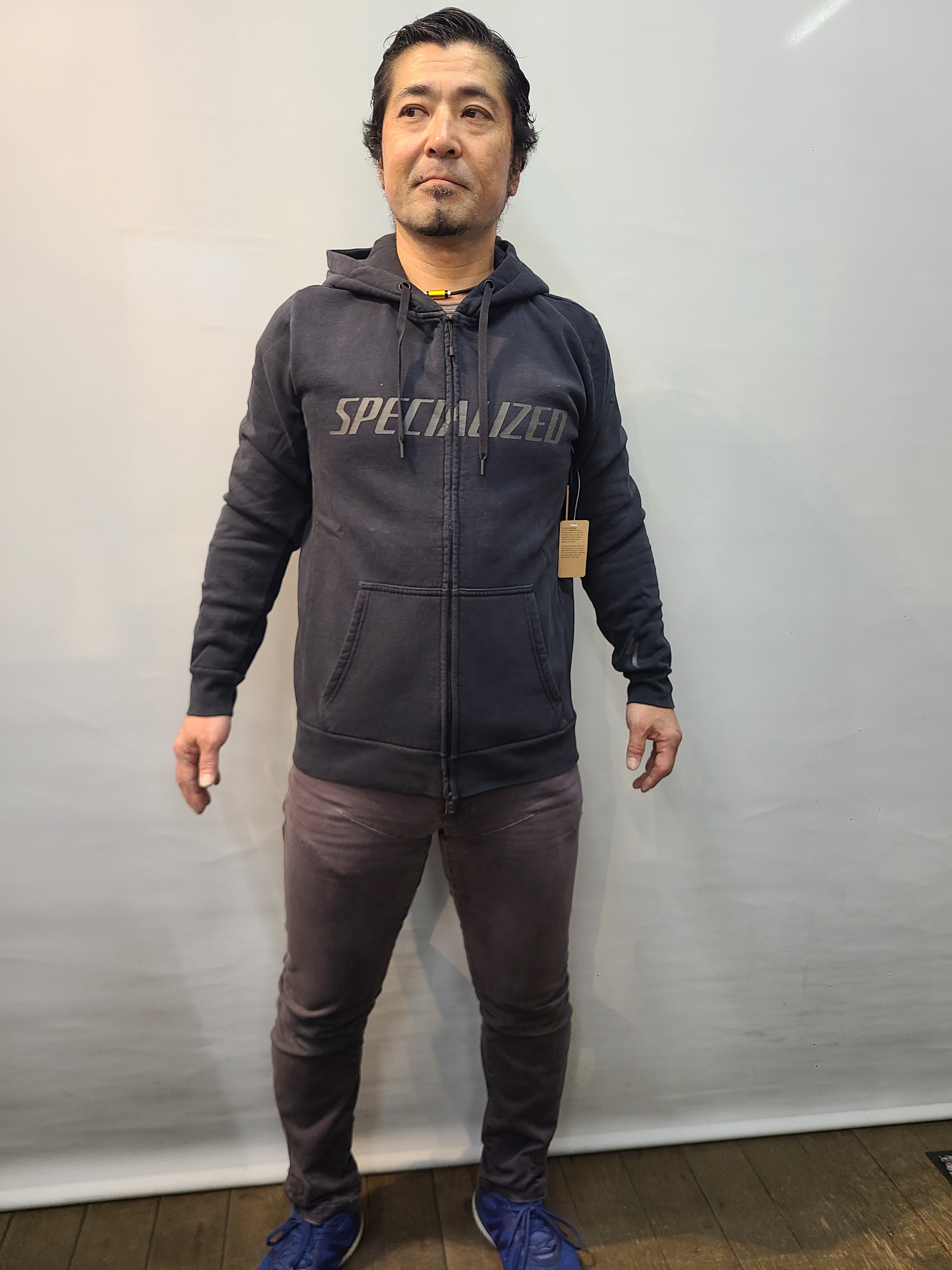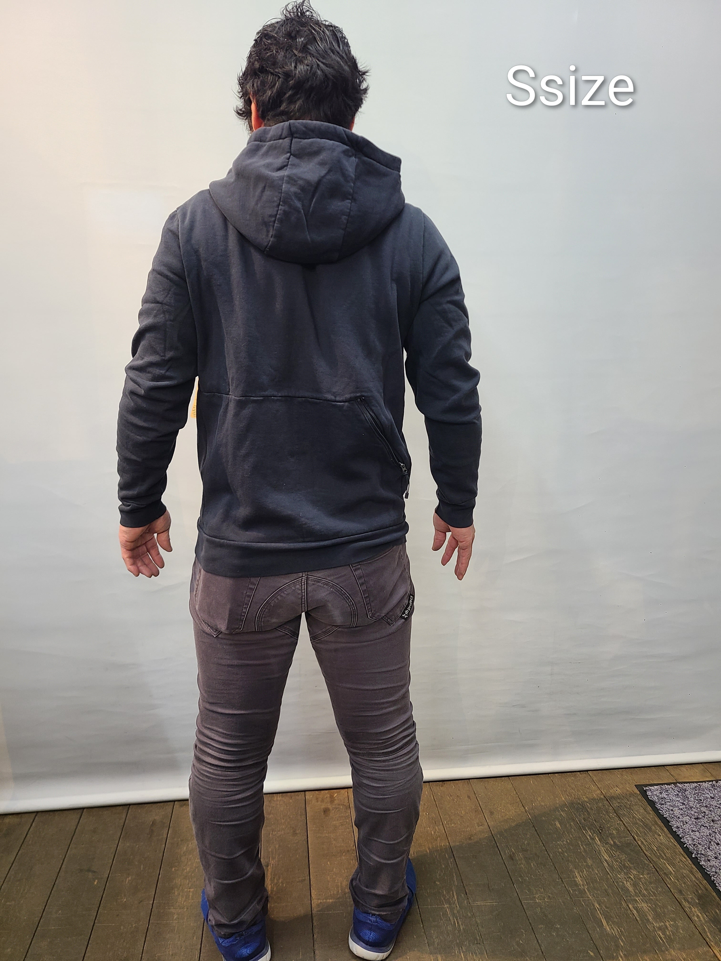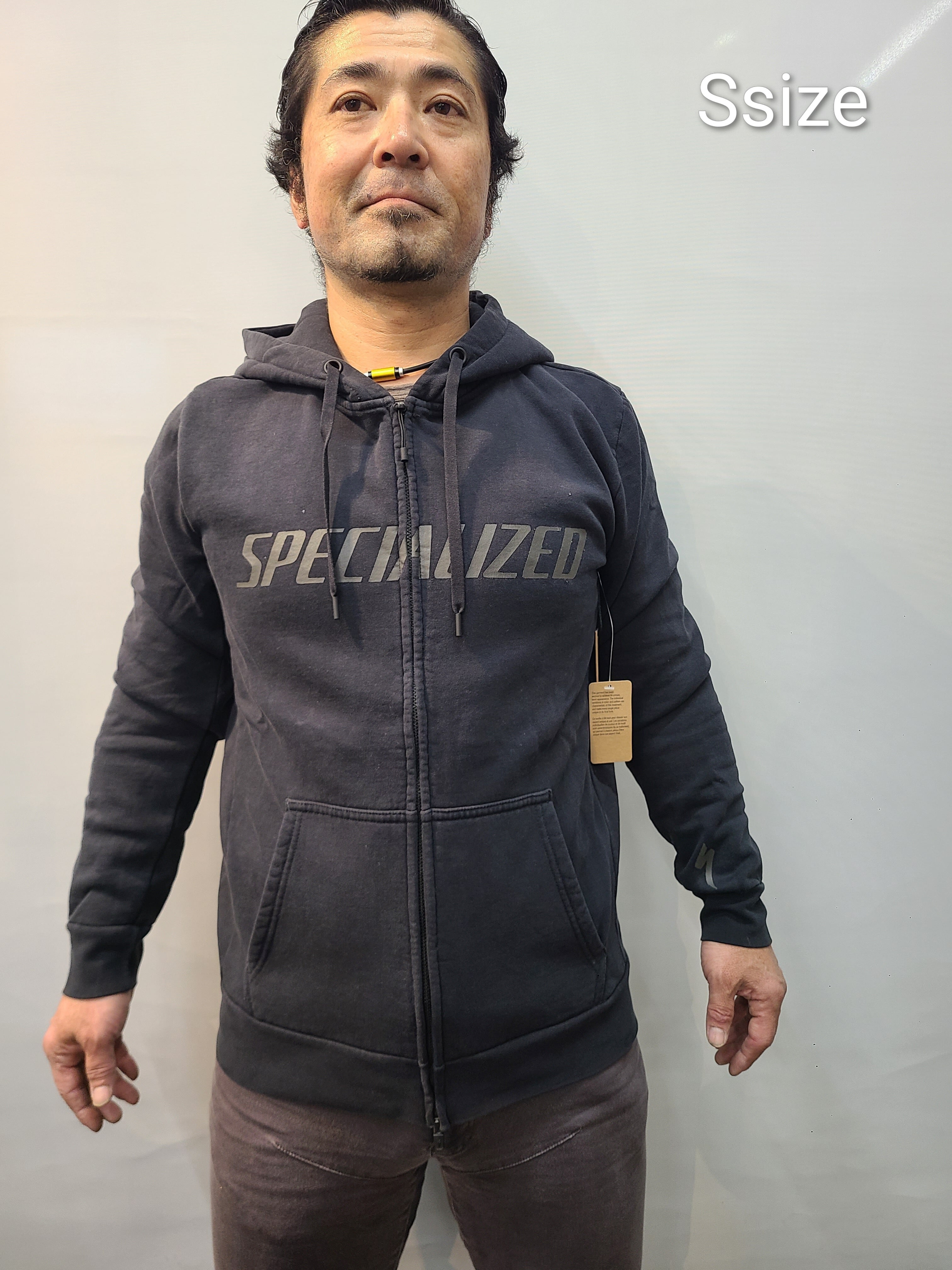 日本人の着用モデルは、当店のスズキ168cm、胸囲95cm、体重75kgが着用してみた感じです。パーカーの中は、ぴったりしたアンダーを一枚着用しています。Sでちょうど、Mならゆとりあり、Mだと着丈が少し長いかなという感じになりました。